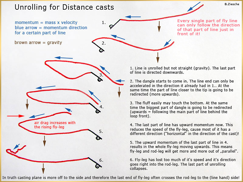 I will attach a link to a picture explaining the whole process more in detail. In true casting we have to take into account that we never cast in one or two dimensions but in 3d... This means the line's end will "jump up and out" since none of us casts 100% vertical that is. The "out" movement will make the fly-leg not only move very fast upwards but outwards and therefore coming back to the line hand side short before last unrolling. Many distance casters will have observed that the fly-leg crosses to the line hand side for the very last part of unrolling and then often collapses - without the help of tailwind or sidewind that is.